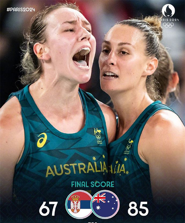 24直播网8月7日讯 巴黎奥运会女篮1/4决赛,塞尔维亚女篮对阵澳大利亚女篮,小组赛两支球队都是2胜1负的战绩排在各自小组第2名。比赛开始,双方上来都迅速进入比赛状态,史密斯撑起澳大利亚进攻,但塞尔维亚女篮能给出回应咬住比分,乔治里突外投连砍7分,澳大利亚首节领先7分,次节墨尔本里突外投接连砍分,澳大利亚顺势拉开双位数领先,随后墨尔本继续上分带领澳大利亚8-0结束半场,领先到16分。下半场,塞尔维亚7-2小高潮止血,但史密斯联手惠特科姆带领澳大利亚回应一波17-0超强攻击波直接拉开近30分领先,末节双方命中率都有下降,塞尔维亚依靠三分追分,但澳大利亚牢牢掌握住20分左右领先优势,最终澳大利亚女篮85-67轻取塞尔维亚女篮,晋级四强,对手将是美国女篮与尼日利亚女篮之间的胜者!