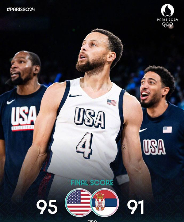 24直播网8月9日讯 奥运男篮半决赛,美国对阵塞尔维亚。比赛开始,库里火力全开3分钟砍下14分,但塞尔维亚多点开花强势回应,次节塞尔维亚连中三分将分差拉开到17分,美国男篮内外开花苦苦追赶,詹姆斯助攻库里飙中三分后自己打成2+1,但半场战罢美国队还是以43-54落后11分。易边再战,双方围绕两位数的分差展开激烈争夺,库里和霍勒迪连中三分,末节塞尔维亚命中率骤降,美国男篮利用防守反击不断蚕食分差,恩比德连得5分率队打出7-0扳平比分,双方争夺陷入白热化,关键时刻詹库合力连得7分完成反超,塞尔维亚后劲不足,最终,美国男篮完成17分的逆转,95-91挺进决赛。