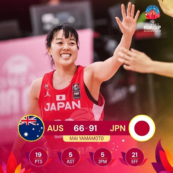 末节,赤穗向日葵破荒,希尔追进三分,马利继续追分,澳大利亚倒也没放弃,赤穗向日葵续上三分火力,日本领先太多,打得也比较随意,桃仁花和宫崎早织连续犯规,星杏璃三分投中,桃仁花弹无虚发,澳大利亚再送失误,星杏璃底角被漏,三分打没悬念,罗奇闪转腾挪,东藤奈奈子锦上添花,罗奇节末几次突破不错,朝比奈梓三分再中,希尔三分球回应,全场打完,日本91比66大胜澳大利亚,成功晋级亚洲杯四强,拿到世界杯资格。