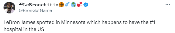 据美网友透露,在布朗尼心脏骤停事件之后,近日詹姆斯被拍到现身明尼苏达,这里有全美最好的医院,疑似为大儿子寻找名医;目前布朗尼已经出院回家,整个人的状态很不错,不过到目前为止,布朗尼心脏骤停的原因仍未确定,也许詹姆斯前往美国最好的医院,就是为布朗尼寻求更多专业的建议。