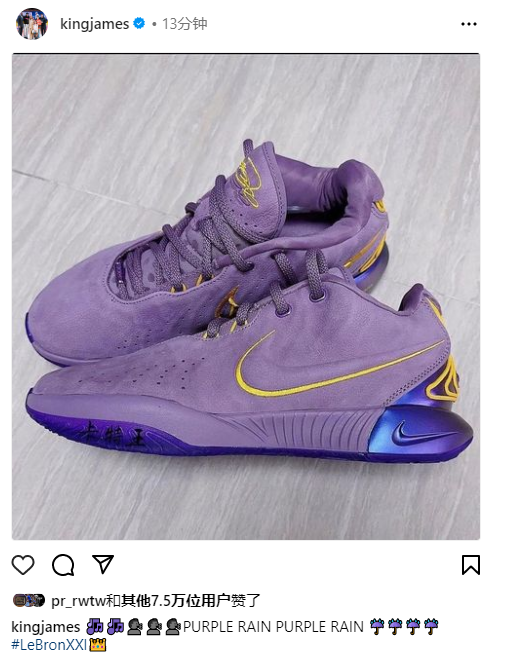 不久前,詹姆斯在社交媒体上晒出他的最新款第21代战靴,这是一款紫金配色的球鞋,如此动态引热议,不到1小时就获得10万+点赞,美媒也转发老詹的这款战靴。