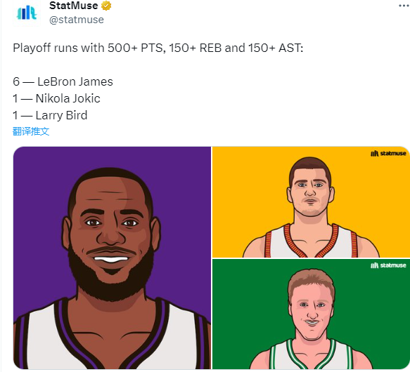 值得一提的是,美媒Statmuse又晒出詹姆斯的一项历史第一纪录,单赛季季后赛总得分500+、总篮板150+和总助攻150+的球员——詹姆斯6次做到历史第一,约基奇和伯德都是仅仅1次。