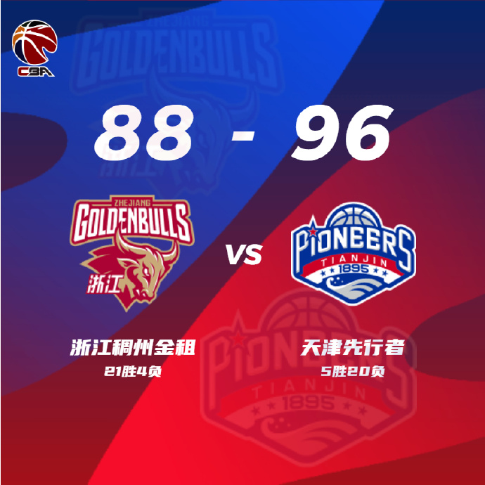 24直播网1月12日讯 CBA常规赛继续进行,领头羊浙江迎战天津,天津近期遭遇四连败后战绩来到4胜20负,目前仅列联赛倒数第三,浙江迎来连胜后战绩更新为21胜3负,继续领跑全联盟。比赛一上来两队进攻稍显滞涩,中段浙江率先找到进攻状态,内外结合的他们逐渐占据上风,首节结束时浙江暂时领先9分,次节回来,天津外线手感滚烫连中三分,双方分差逐渐被缩小,吴前连续突破得手率队稳住局势,半场战罢,浙江依然保有6分优势。易边再战后场上形势风云突变,浙江进攻断电单节仅得到14分,天津延续追分势头,中段一波9-0实现反超,末段浙江进攻依然滞涩,三节结束后天津反超5分,末节上来,浙江找回手感接连追分,无奈天津总能给予回应,决胜时刻双方陷入缠斗,杰弗森飚中冷血三分,浙江追分未果,最终天津96-88力克浙江。