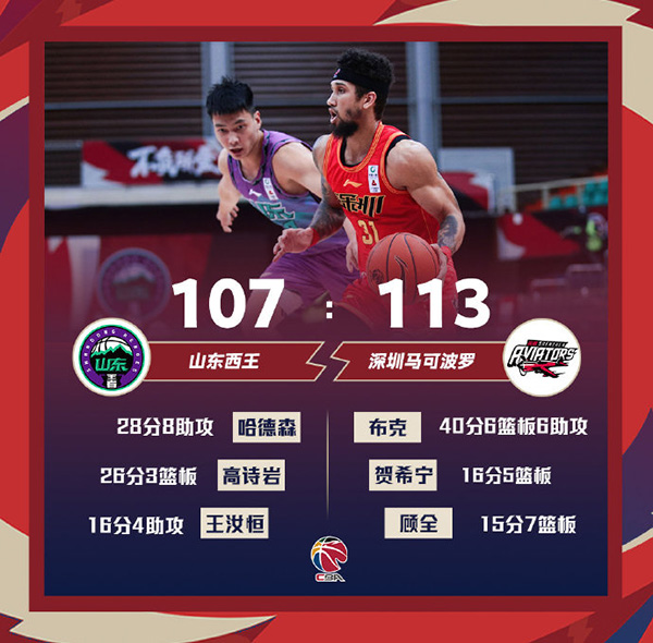 24直播网1月17日讯 CBA常规赛第31轮迎来最后较量,上轮力克青岛的山东迎战两连败的深圳,首节一上来深圳外线率先开张,单节命中5记三分的他们,首节结束时已经取得10分领先,次节回来后山东进攻手感回暖,两队外线火热对飚,半场战罢,深圳继续领先11分。易边再战后山东轰出17-5攻击波反超比分,末段深圳回敬一波13-1小高潮,三节结束后深圳依然领先11分,末节决战,高诗岩联手哈德森不断追分,关键时刻布克和贺希宁先后取分,最终深圳113-107力克山东。