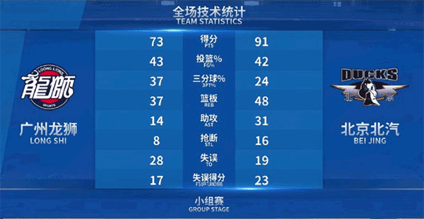单节比分:21-34、22-22、13-19、17-16(广州在前)。