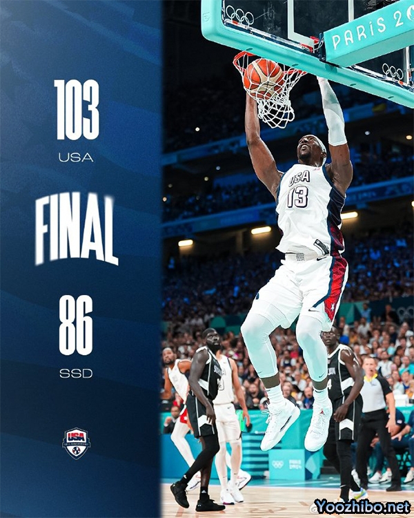 24直播网讯 北京时间8月1日讯 奥运男篮小组赛C组,美国对阵南苏丹。比赛开始,双方开场短暂相持,随后美国男篮加强防守利用反击打出18-4的进攻高潮一举获得两位数优势,阿德巴约内线翻江倒海,哈利伯顿连中三分帮助球队将分差拉开到20分,南苏丹里突外投拿分苦苦支撑,半场战罢美国男篮55-36领先19分。易边再战,库里助飞塔图姆,但南苏丹三分4连击缩小分差,怀特和爱德华兹相继命中三分稳住局势,末节浓眉出现违体犯规,南苏丹趁势连拿5分,美国男篮多点开花打出10-2的小高潮将分差拉开到20分以上,南苏丹大势已去。最终,美国男篮103-86击败南苏丹。