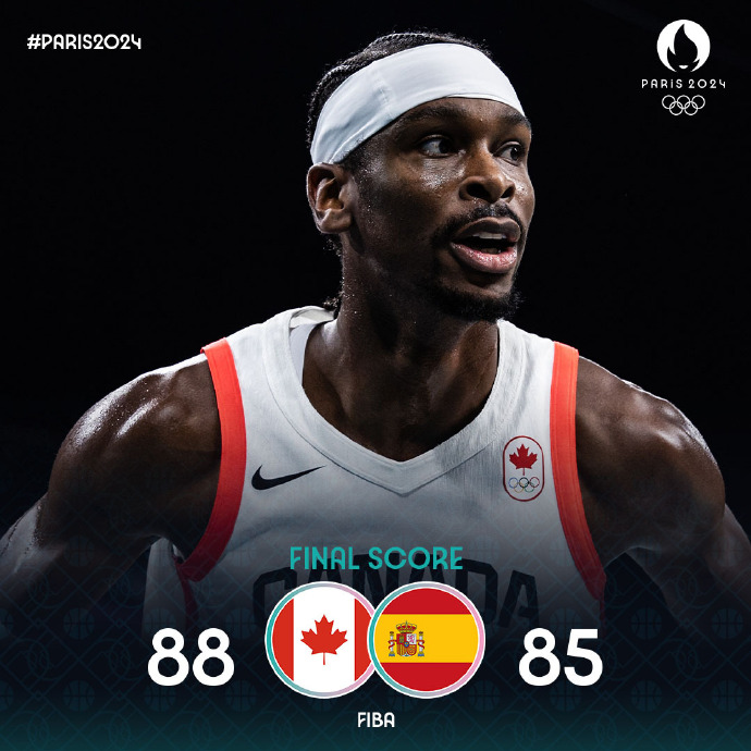24直播网8月3日讯 奥运男篮小组赛A组,加拿大对阵西班牙。比赛开始,加拿大率先发力开局10-4领先,西班牙内外开花回敬13-4的攻击波迅速反超,但次节西班牙命中率下降,加拿大连投带罚一举将分差拉开到两位数,半场战罢加拿大49-38领先西班牙。易边再战,两队围绕10分分差展开激烈争夺,西班牙连中三分缩小分差,加拿大冲击篮筐稳住局势,末节西班牙一度将分差迫近到只剩3分,狄龙得分助攻一肩挑稳住局势,西班牙多点开花顽强咬住,双方争夺陷入白热化,关键时刻巴雷特命中三分将分差拉开到5分,亚历山大两罚中一后鲁尔三分续命。亚历山大两罚全中,最终,加拿大力克西班牙。