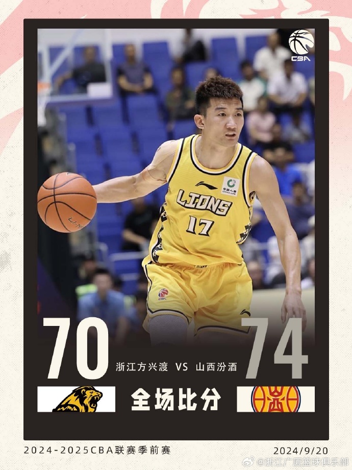 24直播网讯 9月20日讯 CBA季前赛广厦对阵山西,本场比赛胡金秋缺阵。开场两队经过短暂的僵持后浙江进攻陷入低潮,山西在古德温的带领下多点开花建立领先。第二节广厦手感有所回暖,两队陷入拉锯战。下半场回来孙铭徽找到状态带领广厦追分,张宁联手双外援总能及时回应,广厦始终无法追上比分,最终山西74-70力克广厦。
