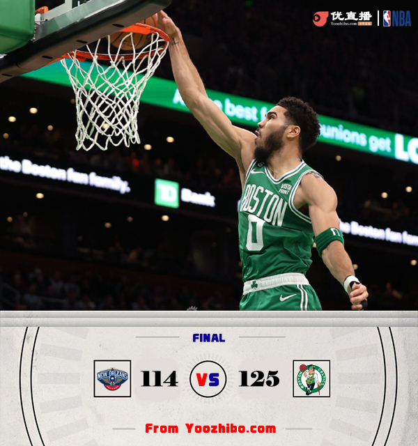 24直播网1月12日讯 今日NBA常规赛凯尔特人主场迎战鹈鹕,此前绿军已经取得三连胜,29胜12负稳居联盟第一,鹈鹕则是以25胜16负位列西部第三。本场锡安继续缺阵,斯玛特和罗威也将缺席比赛。首节上来,两队即陷入拉锯战,交替取分,双方进攻手感都很火热,在外线形成对飙,次节回来鹈鹕陷入得分荒,绿军趁机打出一波9-0取得两位数领先,随后鹈鹕多点开花迫近比分,麦科勒姆上半场手感出色,三分7投6中拿下22分,半场结束凯尔特人64-58领先。易边再战,双方依旧是交替得分,但鹈鹕始终没能反超,节末鹈鹕效率下降,绿军再次领先到两位数,布朗手感爆棚,单节得到18分。末节绿军稳扎稳打继续拉开分差,随着时间流逝,比赛逐渐失去悬念,最终凯尔特人主场125-114力克鹈鹕,取得四连胜。