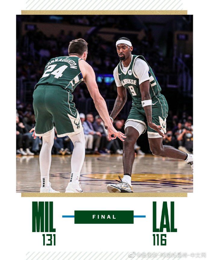 24直播网2月9日讯 NBA常规赛继续进行,湖人主场迎战雄鹿,詹姆斯复出后,湖人上一场逆转尼克斯拿到很关键的一场胜利,雄鹿最近状态也正佳拿到一波3连胜。首节湖人上来连中4记三分开局,但雄鹿也是在字母哥的带领下连续攻击内线回应,湖人连续失误后被雄鹿抓住机会通过三分和反击直接建立双位数领先优势,次节雄鹿越打越好,米德尔顿出色的外线手感帮助雄鹿拉开至20分以上分差,湖人进攻端则全员不在状态,反观雄鹿多点开花半场领先到22分。第三节,雄鹿进攻端持续施压,接连的外线三分帮助雄鹿拉开至30分的分差,湖人仿佛被打没了心气,虽然能打出小高潮止血,但雄鹿还能稳住24分领先,末节詹姆斯连续强打试图掀起反攻,但字母哥都能内线强打回应,中段湖人打出12-1进攻波将分差追至10分,但雄鹿里突外投始终稳住十几分优势,最终雄鹿力克湖人,拿到4连胜。