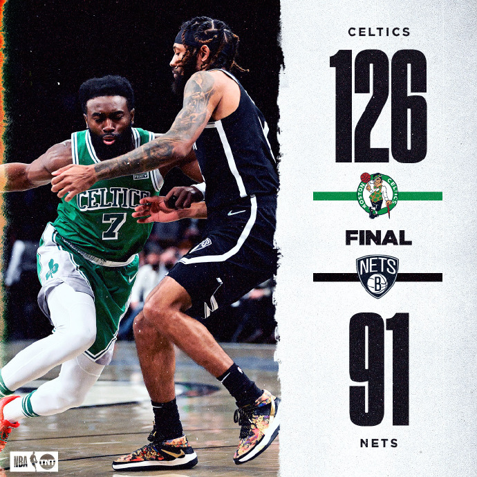 24直播网2月9日讯 篮网在结束5连客之后回到主场迎战凯尔特人,篮网近期状态全无遭遇8连败,在杜兰特和哈登因伤缺阵的情况下,欧文也无法出战主场比赛,因此篮网本场以全替补阵容出战。篮网的全替补阵容在开局完全找不到状态,开场8分钟里他们16投1中并出现5次失误仅得2分,绿军面对对手送上的如此大礼自然是不会放过,他们在布朗独砍12分的带领下轰出28-2的进攻高潮早早拉开比分,篮网在这之后才找到进攻感觉尝试追分,次节初他们用一波9-2的开局曾将分差追至12分,但这之后的绿军再度接管比赛,斯玛特站出来连拿8分带队再掀进攻高潮,绿军很快拉开比分并带着26分的优势进入下半场。第三节绿军依旧占据上风半节时间再送16-7的攻势,分差直接拉大至30分以上也让比赛早早失去悬念。篮网随后只能为缩小分差挽回颜面而战,不过早早撤下主力的绿军也没有给对手任何机会。最终,绿军客场大胜篮网,并送篮网9连败。