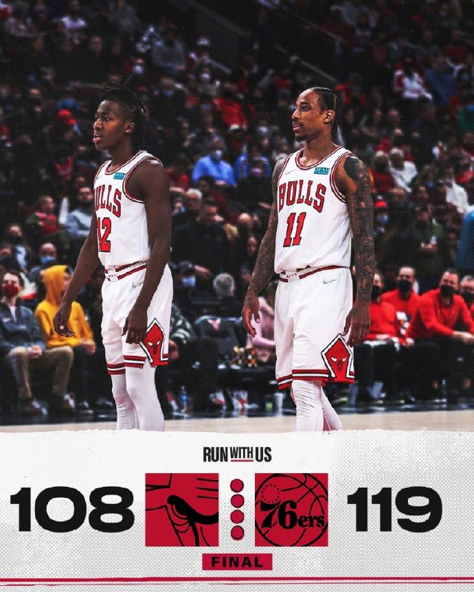 公牛(33-20):德罗赞45分9篮板7助攻、武切维奇23分7篮板5助攻、贾旺特-格林17分2篮板2盖帽、特洛伊-布朗5分5篮板、道苏姆8分2篮板7助攻、托马斯5分6篮板、希尔5分3篮板