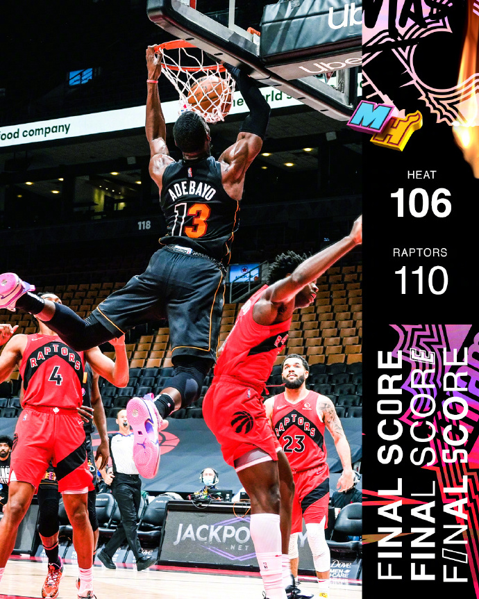 24直播网2月2日讯 NBA常规赛,猛龙主场迎战热火,两队三天前曾大战三个加时,最终猛龙艰难胜出,此役双方均是背靠背作战。首节热火反客为主取得10-3的不俗开局,猛龙之后虽略有复苏无奈防守不给力,热火很快取得了两位数的领先,次节阿丘瓦、特伦特等人轮番发威,几次将分差缩小到个位数,无奈节末阿德巴约大发神威连得6分,热火在半场结束时依旧保有12分的优势。第三节范弗里特终于复苏,他一人连砍11分带队打出一波14-3瞬间迫近比分,可惜球队罚球命中率不高错失了扳平的机会,热火靠着阿德巴约与巴特勒的强攻勉强维持住优势,末节西亚卡姆、阿丘瓦、特伦特三分如雨,猛龙一波10-0终于反超比分,纵使希罗此后带队连续追分却为时晚矣,阿奴诺比空接上篮杀死比赛。最终,猛龙110-106逆转击败热火取得三连胜。