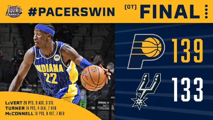 24直播网4月4日讯 NBA常规赛马刺主场迎战步行者,马刺上一场刚刚遭遇败仗,步行者则已经是三连败,此役布罗格登和萨博尼斯缺阵。首节两队陷入拉锯战,马刺主打投篮,步行者则错位追打珀尔特尔,德罗赞和勒韦尔作为双方主攻点状态俱佳。步行者连续失误导致马刺将分差拉大到十分,但很快步行者打出10-0追平,首节马刺33-32领先一分。次节两队外线手感升温,进入对攻,麦康纳和霍勒迪连续强突使球队逐渐获得优势,节末米尔斯连得五分帮助球队追分,但勒韦尔也连得五分重新拿回优势,步行者67-59领先。易边再战,场上风云突变,马刺连续打成,一波13-5很快抹平分差,随后德罗赞连取八分,带领马刺众人发力,将领先优势扩大到两位数,调整过后,步行者开始追分,霍勒迪和马丁连中三分,本节结束前比塔则反击造杀伤将比分再次反超,步行者98-97领先。末节开战步行者延续进攻势头,逐渐掌控优势,此后两队交替得分,分差维持在六分上下无法迫近,最后两分钟盖伊站出来连续取分蚕食分差,德罗赞两罚中一后比分追平,特纳和德罗赞绝杀都不中,进入加时。加时赛开场两队交替取分,麦康纳站出来,作为主攻点连取六分,帮助球队获得领先优势,特纳关键时刻篮下切掉德罗赞,马刺无力再抹平分差,步行者以139-133客场取胜,终结三连败。