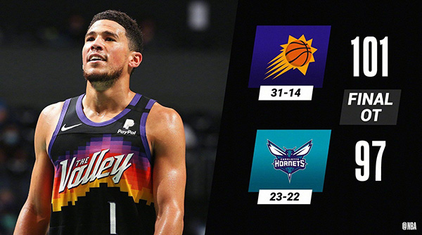 24直播网3月29日讯 NBA常规赛黄蜂主场对阵太阳,黄蜂近来状态不错拿到3连胜,太阳则是仍旧高居西部第二。开场后黄蜂外线手感不错连中三分取得领先,布克和艾顿两人轮番拿分带领太阳紧追不舍,但黄蜂多点开花始终保持微弱优势,第二节上来太阳先是打出11-0完成反超。但此后场上局面陷入僵持,场上比分交替上升,半场过后,两支球队打成49平。下半场回来太阳以14-1开局,不过得益于迈尔斯-布里奇斯和科迪-马丁的活跃发挥,黄蜂又将分差缩小到个位数。第四节太阳进攻低迷,格拉汉姆最后时刻连中三分帮助黄蜂打成90平将比赛拖入加时。加时赛中两队仍旧手感一般,不过太阳略胜一筹,最终太阳加时101-97终结黄3连胜。