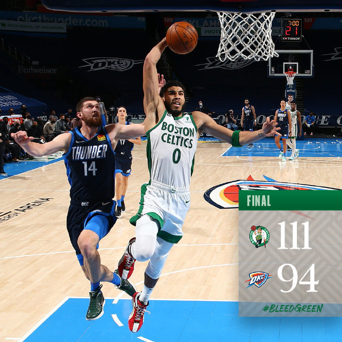 24直播网3月28日讯 NBA常规赛,雷霆今日迎战凯尔特人,前者上场比赛输给了灰熊排在西部第十三位,而后者上场比赛则是战胜了雄鹿,暂列东部第七位,本场亚历山大、霍福德和沃克等人缺战。比赛上来多特就表现出了火热的状态,个人连拿八分帮助雷霆取得领先,凯尔特人首发的糟糕表现让分差逐渐达到了两位数,好在是替补球员上来后迫近比分,次节双探花终于回暖一度追平比分,但一直未能实现反超,半场结束时雷霆领先5分。易边再战,凯尔特人依旧被对手压制,不过到了末节雷霆突然开始不得分,前六分钟仅靠罚球拿到两分,凯尔特人终于把握住机会打出一波19-0的攻势直接反超并建立起两位数的领先优势,比赛就此失去了悬念,最终凯尔特人逆转雷霆获得连胜。