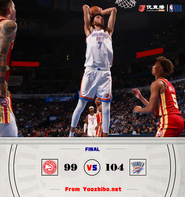 24直播网10月18日讯 NBA季前赛,老鹰对阵雷霆,本场比赛老鹰主力休战,雷霆则是亚历山大和杰伦-威廉姆斯领衔先发。比赛开场后雷霆多点开花取得领先,并且一度领先到两位数老鹰依靠三分追赶比分,首节后半段雷霆命中率下降,老鹰冲击内线完成反超,巴夫金状态火热接连拿分。第二节雷霆上来打出一波11-0的攻势夺回另外,随后老鹰连续拿分做出回应,杰伦-威廉姆斯崴脚离场,两队你来我往陷入僵持。下半场回来雷霆也主要安排替补阵容出战,场上局面依旧十分胶着。最后一节两队依旧是拉锯战,雷霆始终保持微弱优势,老鹰最后采用犯规战术也未能上演奇迹,最终雷霆104-99力克老鹰。