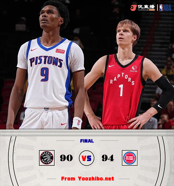 双方比分及数据: 单节比分:18-26,36-16,19-25,17-27(猛龙在前) 猛龙:迪克22分7板3助,哈珀12分7板,格耶15分7板3助,布朗13分8板3帽,诺威尔9分6助,内姆哈德13分3板。 活塞:汤普森17分9板3助4断2帽,萨瑟15分3板7助2断,罗登18分8板2助2断,厄沃马6分2板,农杰8分3板2助3断,乌姆德7分2断,卡扎隆7分2断,博海姆5分,赛克斯6分3助2断。 双方首发: 猛龙:哈珀、格耶、摩西-布朗、迪克、诺威尔 活塞:罗登、Tosan Evbuomwan、Jack Nunge、汤普森、萨瑟