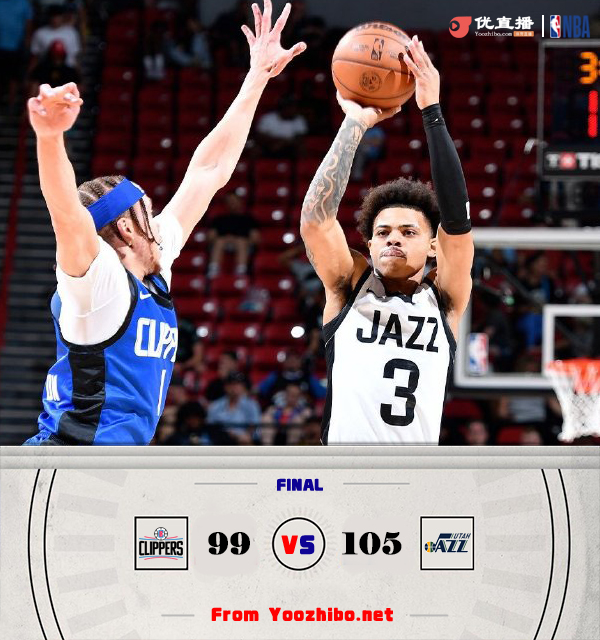 24直播网7月9日讯 拉维斯加斯夏季联赛继续进行,快船和爵士直接交锋,爵士这边阿巴基和朱赞领衔,今年的16号秀基昂特-乔治继续出战,快船这边普雷斯顿领衔,今年的30号秀科比-布朗和48号秀乔丹-米勒在列。比赛开始后快船率先发力,普雷斯顿联手迪亚巴特轮番取分,爵士连中三分强势回应,中段两队外线火热对飚,爵士多点开花逐渐拉开比分,首节结束时爵士领先7分,次节回来,两队进攻火力放缓,快船始终无法打出追分高潮,中段爵士外线续上火力继续扩大优势,半场战罢,爵士继续领先10分。易边再战后普雷斯顿率队追分,阿巴基内外结合立刻回应,乔治接连取分,三节结束后爵士依然保有6分优势,末节决战,乔治无人可挡连中三分,单节狂揽17分,阿巴基里突外投继续取分,两人联手率队再次确立两位数优势,末段穆恩连中三分,但无奈追分未果,最终爵士105-99击败快船。