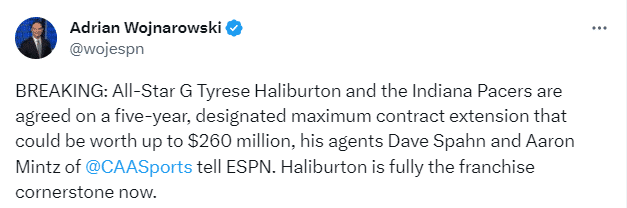 24直播网讯07月02日,NBA自由球员交易市场正式开启,多名球员签下大合同,据名记woj报道,步行者和哈利伯顿提前续约,最高5年2.6亿美元,步行者已经把他视为球队的基石人物。