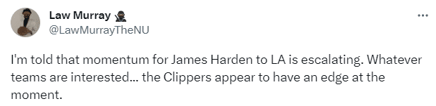 快船记者Law Murry表示哈登加盟快船的势头正在上升,无论其他球队是否有兴趣,目前快船似乎都有优势。如果快船续约威少并且交易得到哈登,快船新赛季潜在首发将是威少、哈登、乔治、小卡和祖巴茨。