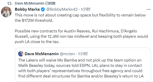 薪资专家Bobby Marks表示湖人此举并不是为了创造上限空间,而是为了保持在 1.72 亿美元奢侈税门槛以下的灵活性,里夫斯、八村垒和拉塞尔可能签订新的合同。