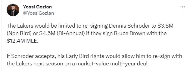 薪资专家Yossi Gozlan表示,如果湖人队用 1240 万美元全额中产签下布鲁斯-布朗,那么他们只能以 380 万美元或 450 万美元(双年特例)重新签下施罗德。 如果施罗德接受,他的早鸟权将使他能够在下赛季与湖人队以一份具有市场价值的多年合同重新签约。