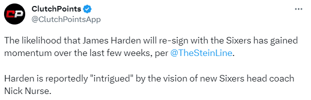 24直播网讯06月26日,名记报道哈登和76人续约的可能性增加,对新帅纳斯的想法很有兴趣;另外费城记者表示76人已经放弃交易哈里斯,太阳也不再追求他。