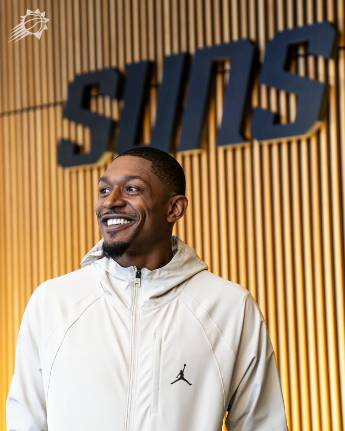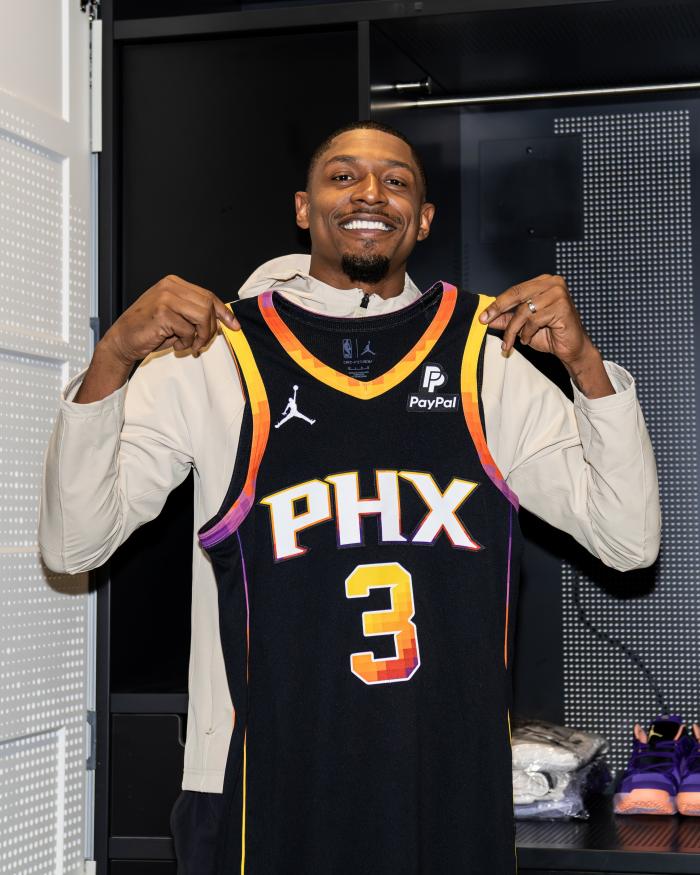 太阳豪赌引援比尔打造超级四巨头,比尔已经抵达菲尼克斯并且现身太阳主场,在更衣室中,比尔手持太阳队3号球衣亮相,全程面带笑容,很明显,他对加盟太阳联手杜兰特和布克十分开心。