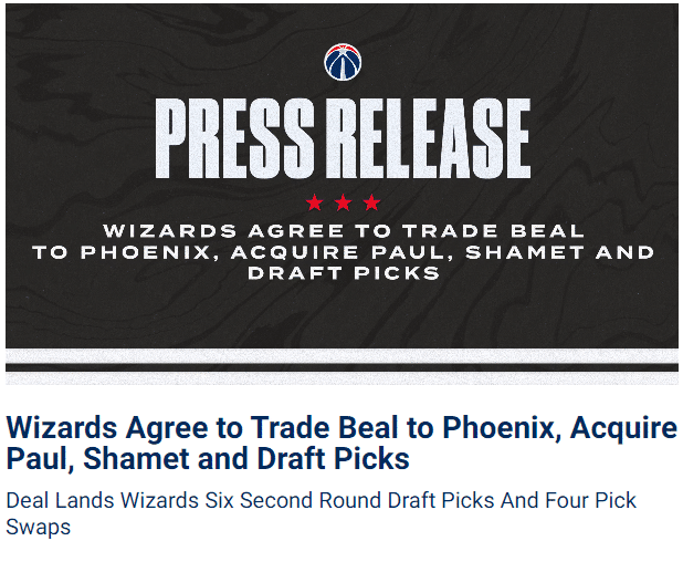 奇才得到:保罗、沙梅特、5个次轮(来自太阳的2024、2025、2026、2027和2030年次轮签)、4个首轮互换权(来自太阳的2024、2026、2028、2030年首轮互换)、部分现金(350万美元)、7号签(来自步行者,选中库利巴利)