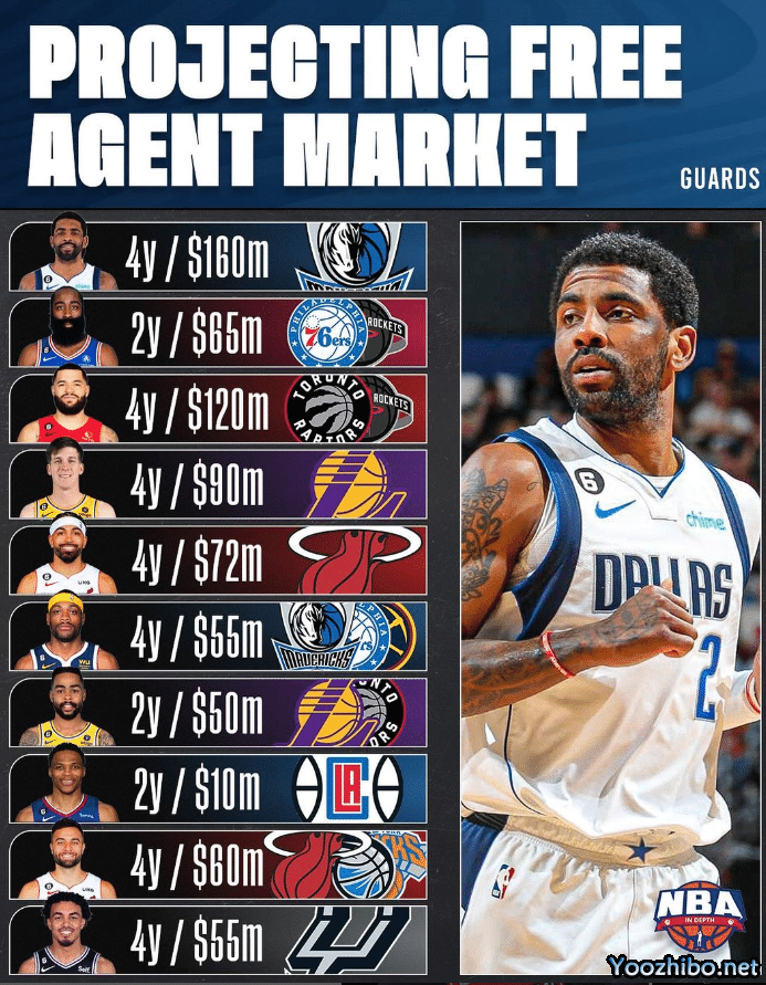 欧文4年1.6亿美元和独行侠续约;哈登2年6500万美元和76人续约或者重返火箭;范弗利特4年1.2亿美元和猛龙续约或者加盟火箭;里夫斯4年9000万美元续约湖人;文森特4年7200万美元续约热火;布鲁斯-布朗4年5500万续约掘金或者加盟独行侠、76人;拉塞尔2年5000万美元续约湖人或者先签后换被交易到猛龙;威少2年1000万美元续约快船;斯特鲁斯4年6000万美元续约热火或者加盟尼克斯以及魔术;特雷-琼斯4年5500万美元续约马刺。