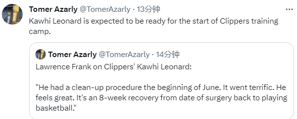 24直播网06月24日讯 ,在NBA选秀结束后,快船总裁劳伦斯-弗兰克辟谣,快船继续围绕小卡和乔治打造球队,透露小卡已经成功接受半月板清创手术,预计8周后康复;快船总裁还表示希望威少能够续约回归。