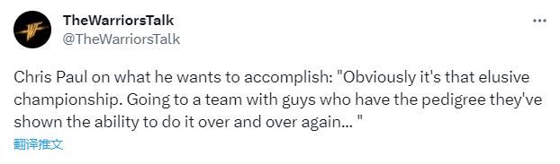 当被问及自己加盟勇士后想要实现的目标,保罗表示:很明显,就是总冠军,加入这样一支拥有冠军血统的球队,他们已经一次又一次地展示了他们有这样的能力。