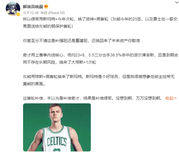 不少球迷表示凯尔特人送出的是队内核心之一、上上个赛季的NBA常规赛最佳防守球员,所以自然要得到回报,也就是换回首轮,毕竟波尔津吉斯还没有在季后赛中证明过自己的实力。所以凯尔特人得到首轮签,也就可以理解了,所以整体上来看,凯尔特人虽然忍痛付出了斯玛特,但换来了希望得到的波尔津吉斯和首个首轮签,还是有保障的。