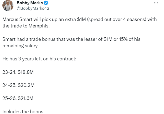 Woj表示,灰熊一直在为这支年轻的球队寻找一位意志坚强、经过季后赛考验的老将,所以他们引进了斯玛特;薪资专家Marks表示,通过这笔交易,斯玛特将额外获得100万美元的交易保证金,他的合同还剩 3 年: 23-24赛季1880 万美元 24-25 赛季2020 万美元和25-26赛季2160 万美元。