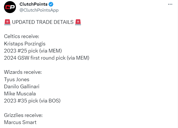 凯尔特人送走斯玛特、加里纳利、穆斯卡拉,得到波尔津吉斯和两个首轮签(这两个签分别是2023年的25号签和2024年来自勇士的前4保护的首轮签。)