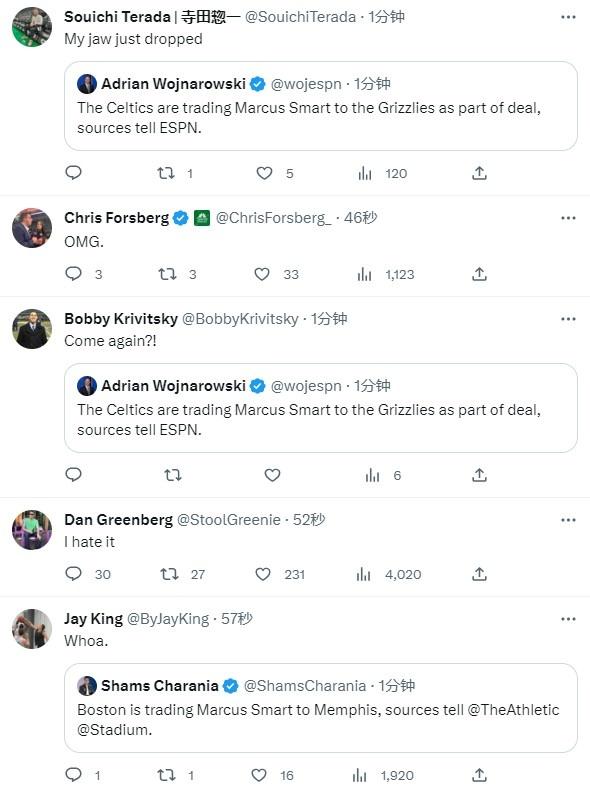 斯玛特被交易引热议,多名绿军记者表示震惊,Souichi Terada表示我的下巴都惊掉了;Chris Forsberg:我的天啊。Bobby Krivitsky表示:“你再说一遍?!