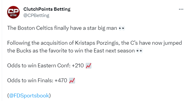 据美媒报道,凯尔特人终于得到一名全明星级别的大个子球员,波神加盟后,凯尔特人已经超越雄鹿成为新赛季东部冠军最大热门;目前凯尔特人夺得东部冠军的赔率是+210,夺冠赔率为+470。