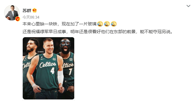 国内名嘴发声,苏群发微博:本来心里缺一块铁,现在加了一片玻璃;还是祝福绿军早日成事,明年还是很看好他们在东部的前景,能不能夺冠另说。