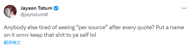绿军、快船和奇才三方交易引热议,波尔津吉斯冲上推特热搜榜。凯尔特人球星塔图姆十分不满,发推回应交易流言,写道:还有谁也厌倦了‘根据消息人士透露’这种句式吗?把名字写上去!不然就把这些话憋在你心里!