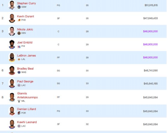 排名第3的是约基奇、恩比德和詹姆斯,同为4690万美元。约基奇是新晋FMVP,两届MVP;恩比德也是MVP;詹姆斯自不必说,是联盟目前的图腾。虽说恩比德受到的非议很多,但3人的确应该拿到这份薪水。
