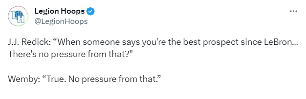 文班亚马表示:是的,没有压力,因为当他们这么说的时候,这并不像是一种奖励。