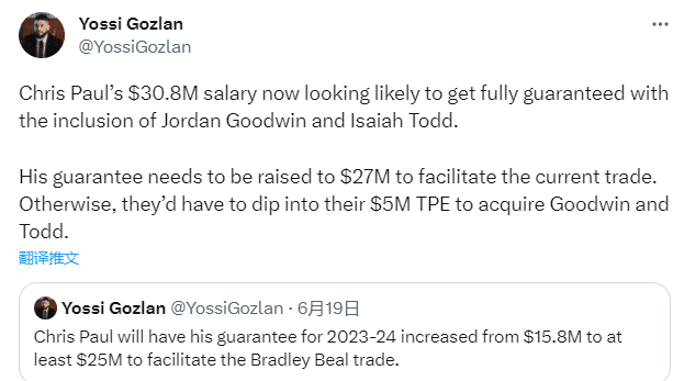 随着古德温和以赛亚-托德加入到交易,保罗下赛季的保障金额需要提高到2700万美元才能促成这笔交易,否则他们将不得不占用中产特例中的500万美元才能签下古德温和托德。