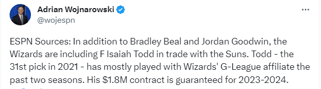 名记Woj进一步报道,除了比尔和古德温之外,奇才队在与太阳队的交易中还包括以赛亚-托德。