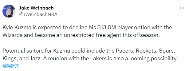 据美记Jake Weinbach报道,库兹马的潜在追求者包括步行者、火箭、马刺、国王和爵士,库兹马重返湖人也有着“迫在眉睫”的可能性。