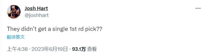 尼克斯球员哈特更推吐槽:他们(奇才队)甚至没有得到一个首轮选秀权?