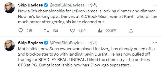名嘴Skip吐槽:“在得到杜兰特之后,伊什比亚,这位太阳新老板已经完成了第二笔重磅交易,比尔将加盟菲尼克斯,感觉就是如此不真实。我更喜欢保罗打控卫时的化学反应,但至少现在伊什比亚已经拥有三位自尊心没那么强的超级巨星了。”