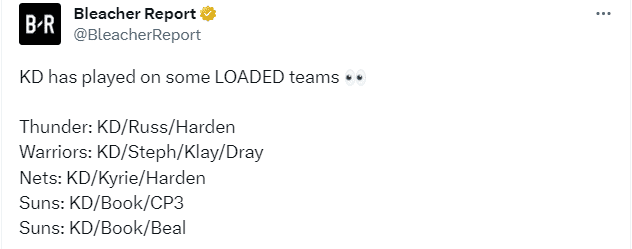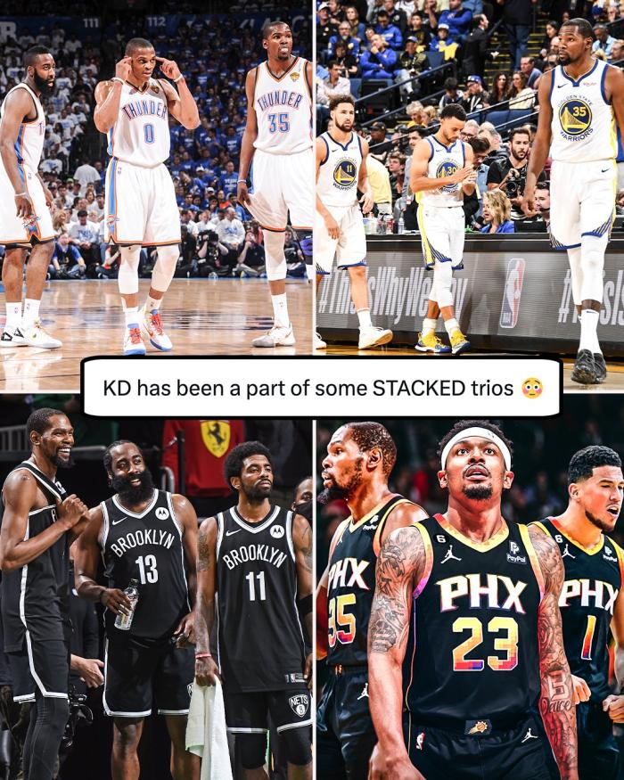 杜兰特又迎来超级球队被嘲讽,美媒《露天看台》列为杜兰特生涯至今组成的超级球队——雷霆时期杜兰特、哈登和威少;勇士时期杜兰特、库里、汤普森和格林;篮网时期杜兰特、欧文和哈登;太阳时期杜兰特、布克和保罗,现在变成杜兰特、布克和比尔。