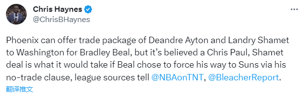 据名记Chris Haynes报道,太阳可以为奇才提供的交易方案包括中锋德安德烈-艾顿和后卫兰德里-沙梅特,但包含保罗和沙梅特在内的交易方案或许会是最终方案,这样才能让比尔放弃使用交易否决权。