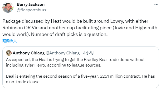 据报道,热火想要用凯尔-洛瑞和邓肯-罗宾逊以及多个首轮选秀权来作为筹码换取比尔;热火队记Anthony Chiang报道,热火正试图在不送出希罗的情况下交易得到比尔。